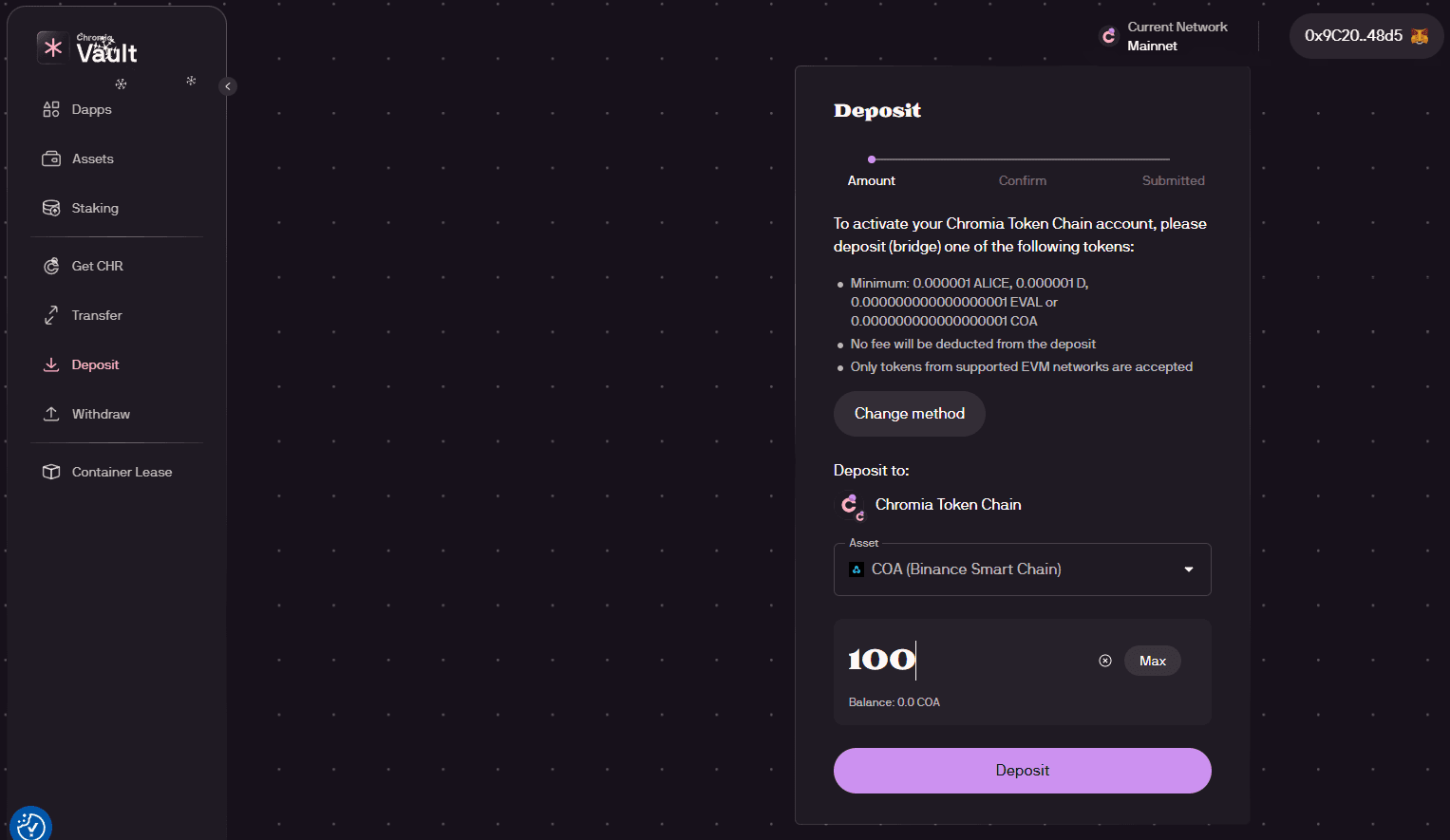 Deposit COA tokens from any supported network into the Chromia Token Chain